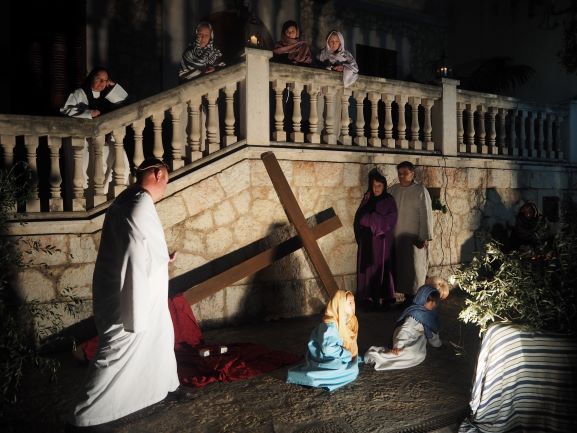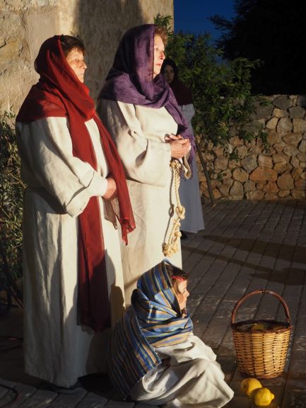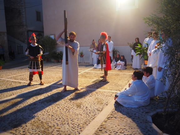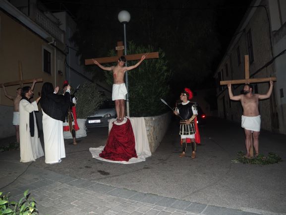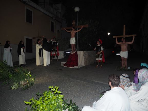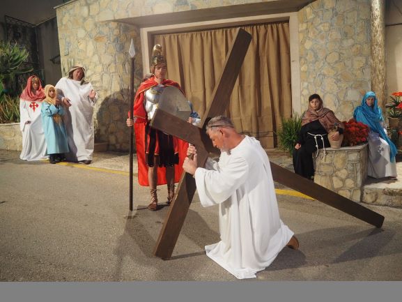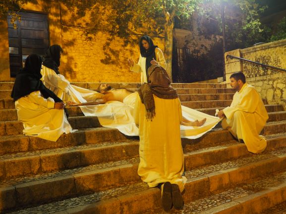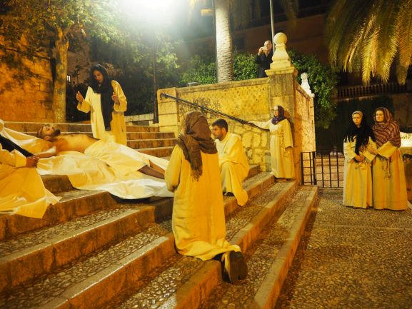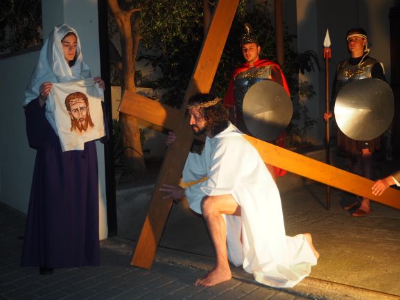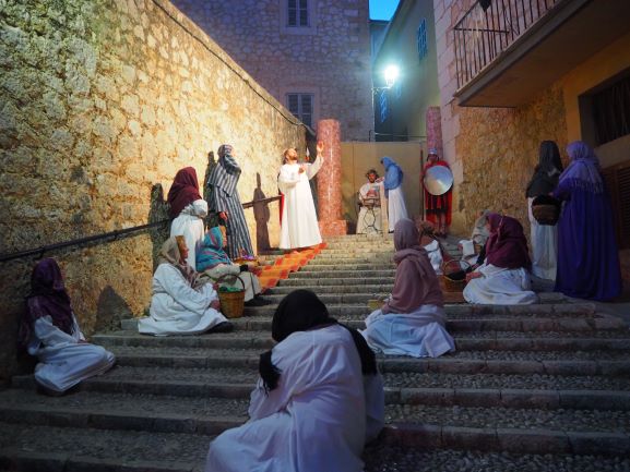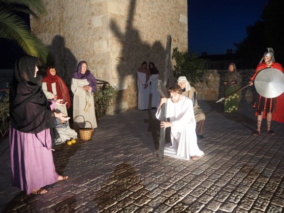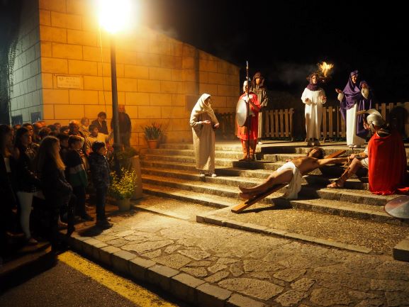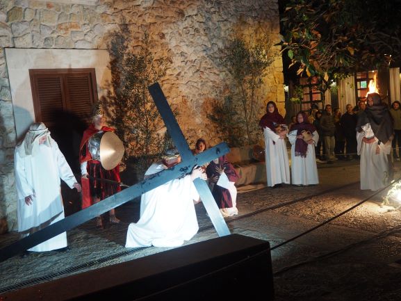 Sobre aquest escenari, es medità i pregà la passió del Senyor, en un Viacrucis guiat pels preveres i diaques de la Unitat de Pastoral. Es recorregueren les 15 estacions, llegint en cadascuna d’elles el fragment de l’Evangeli corresponent, una meditació i una oració. La policia local i protecció civil ajudà a regular a regular el trànsit durant tot l’itinerari, que començà a les escales de Ca ses monges i acabà a l’interior de l’església parroquial, on es representà la darrera estació, la resurrecció, amb una mortalla buida damunt la pedra del sepulcre. Davant aquesta estació tots els assistents resaren junts el Credo, per expressar la seva fe en el misteri de la mort i resurrecció del Senyor que acabaven de contemplar.