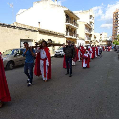 Posteriorment a les 16,30 va començar la processó, que és esperada amb il·lusió a la barriada. La imatge del Sant Crist del Perdo i la Bona Mort, que estava al costat del presbiteri va ser agafada per quatre confrares i va realitzar la sortida del temple per la porta principal.