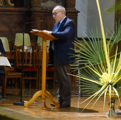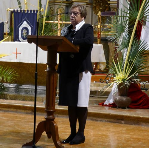 Per part de la confraria Antonio Reus, va saludar als presents, va agrair la col·laboració de la Unitat de Pastoral de la Mare de Déu per poder celebrar aquest acte. En el primer banc de la part dreta hi havia una representació del Consistori local amb l’alcalde Virgili Moreno i en la part dreta l’Associació de Confraries de Setmana Santa amb la pregonera costat de Pep Fernández.