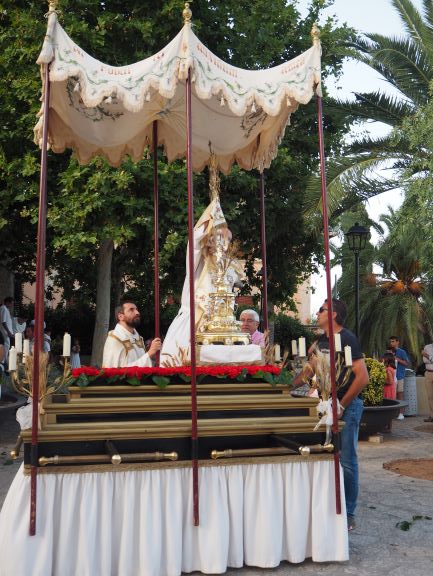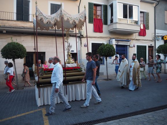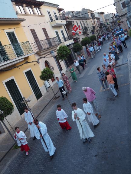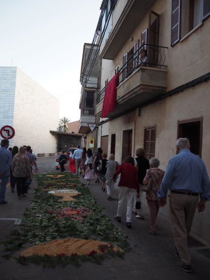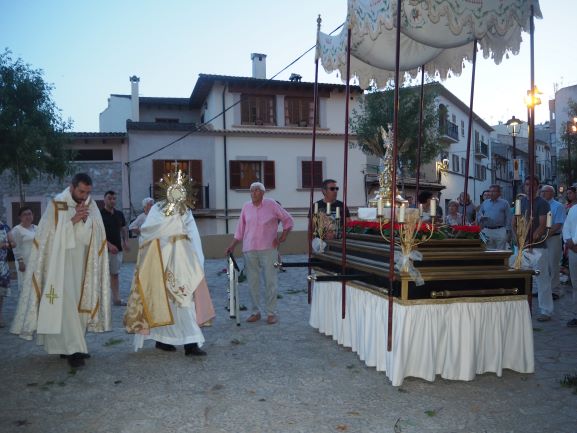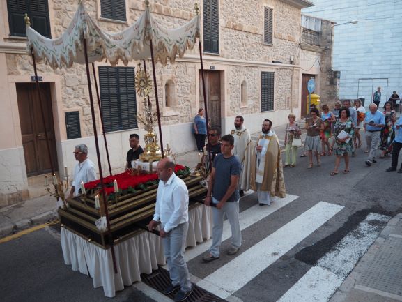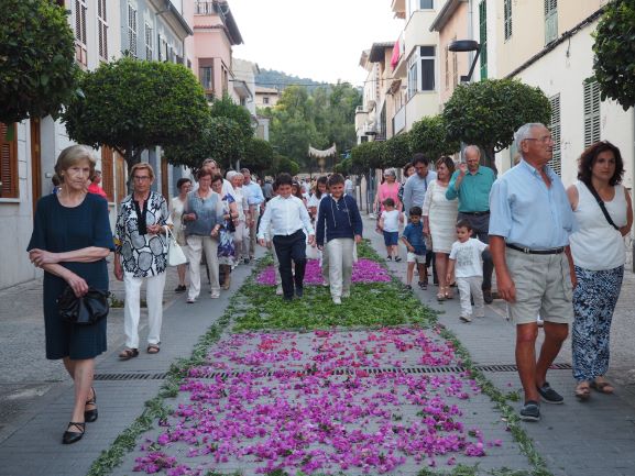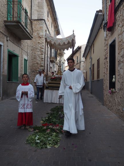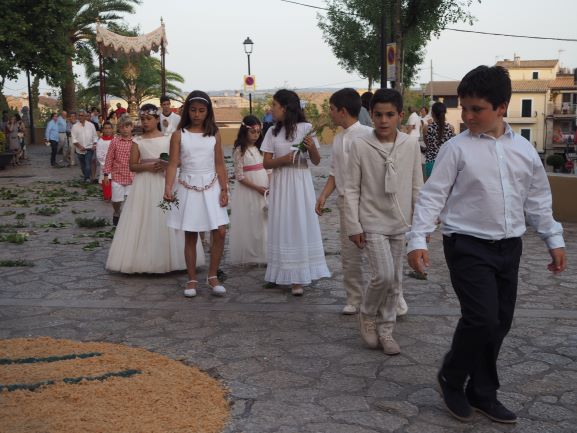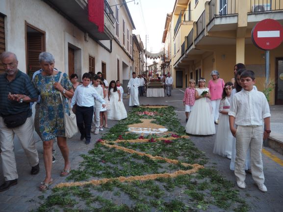 La manifestació de fe també es va viure en la processó que recorregué pels carrers del poble. Els veïnats de Lloseta havien engalanat molts de trams del recorregut amb domassos i estores florals per rebre amb tota solemnitat al Senyor, en la forma del pa eucarístic. Al davant hi anava la creu, seguida del poble, i just després els nins i nines que enguany s’han acostat per primera vegada a l’Eucaristia, que anaven ben aprop de la custòdia, portada per un grup de pares i acompanyada també pels sacerdots. Al darrera, el coro parroquial acompanyà amb els seus cants litúrgics tot el recorregut, que finalitzà de nou a l’església amb una pregària i la reserva. Un any més els cristians de Lloseta han volgut manifestar enmig del poble qui és el que sosté les seves vides.