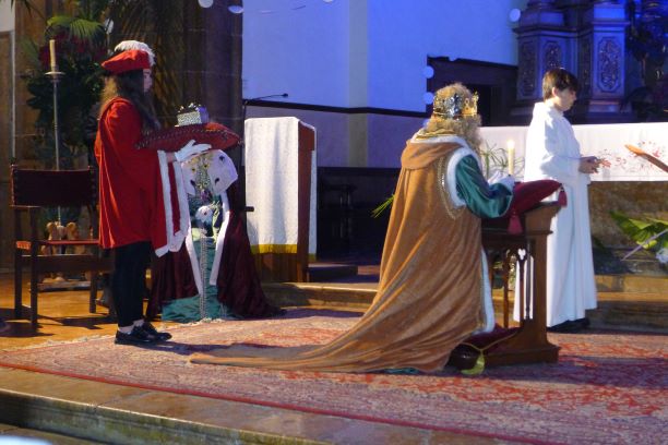 A l’interior de l’temple Ses Majestats adoren el Nen Déu i li ofereixen Or, encens i Mira i es dirigeixen als fidels. Són saludats per l’alcalde que els lliura la clau de la ciutat perquè puguin repartir regals a tots els nens que s’han portat bé a Inca i que són la majoria.