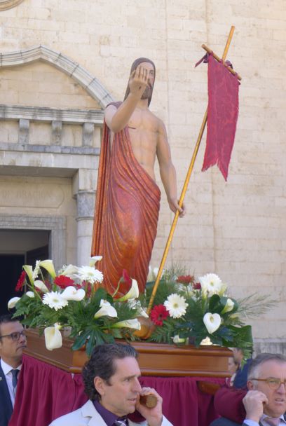 La imatge de Jesús Ressuscitat, sortia de el temple de la Parròquia de Santa Maria la Major. Juntament amb els Cossiers, sacerdots i escolans i la Unió Musical Inquera es dirigien cap al carrer Jaume Armengol, a l’altura de l’encreuament dels carrers Corro i Antonio Fluxá.