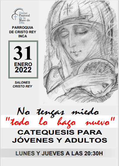 El proper dilluns dia 31 de gener, comencen a les sales parroquials de CRIST REI D’INCA, unes catequesis per a joves i adults, organitzades per les comunitats neocatecumenals. Seran tots els dilluns i dijous de 20:30h. a 21:30 h.