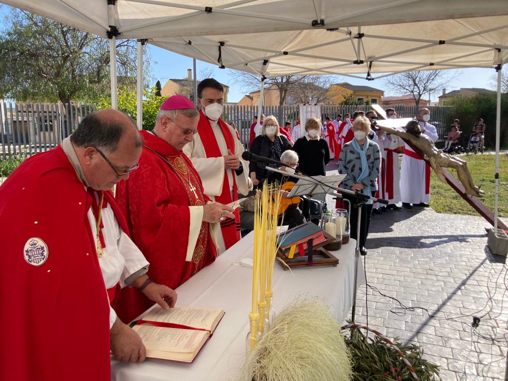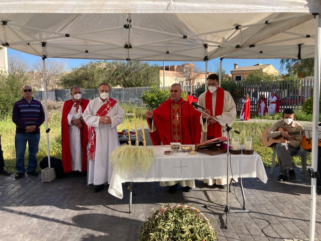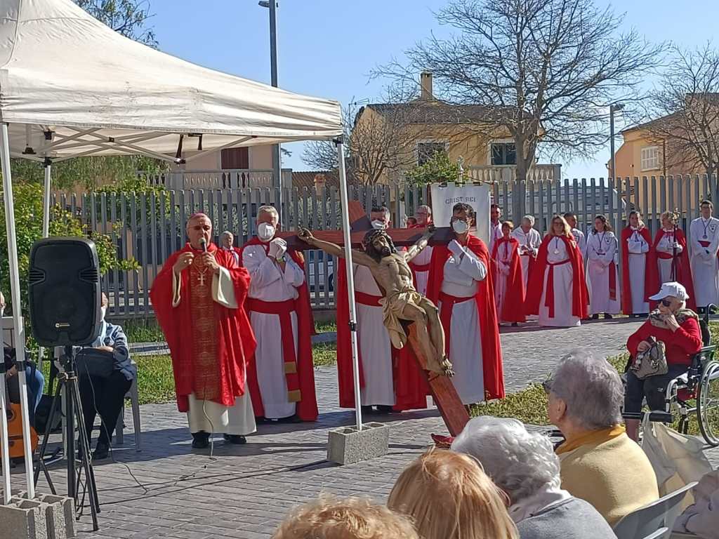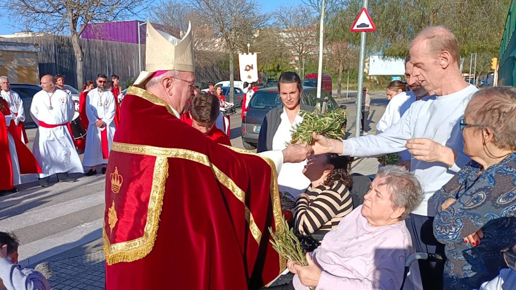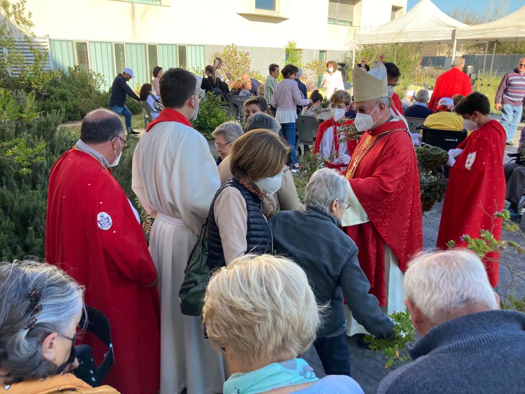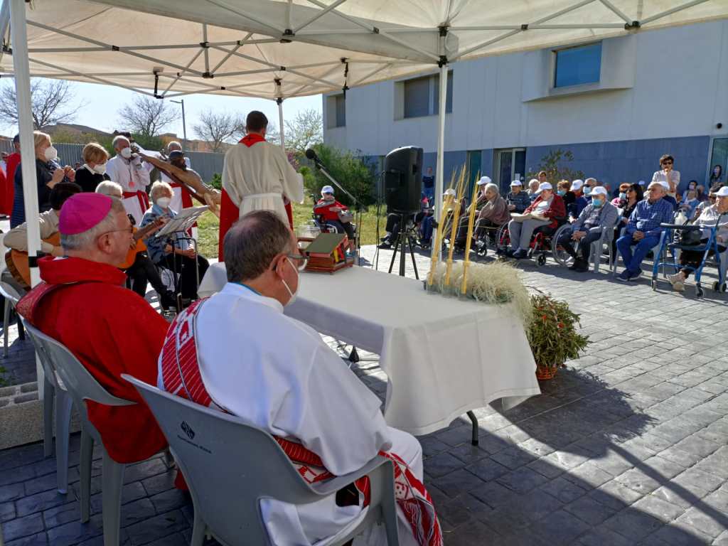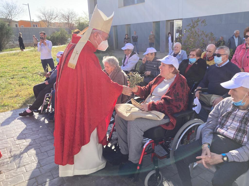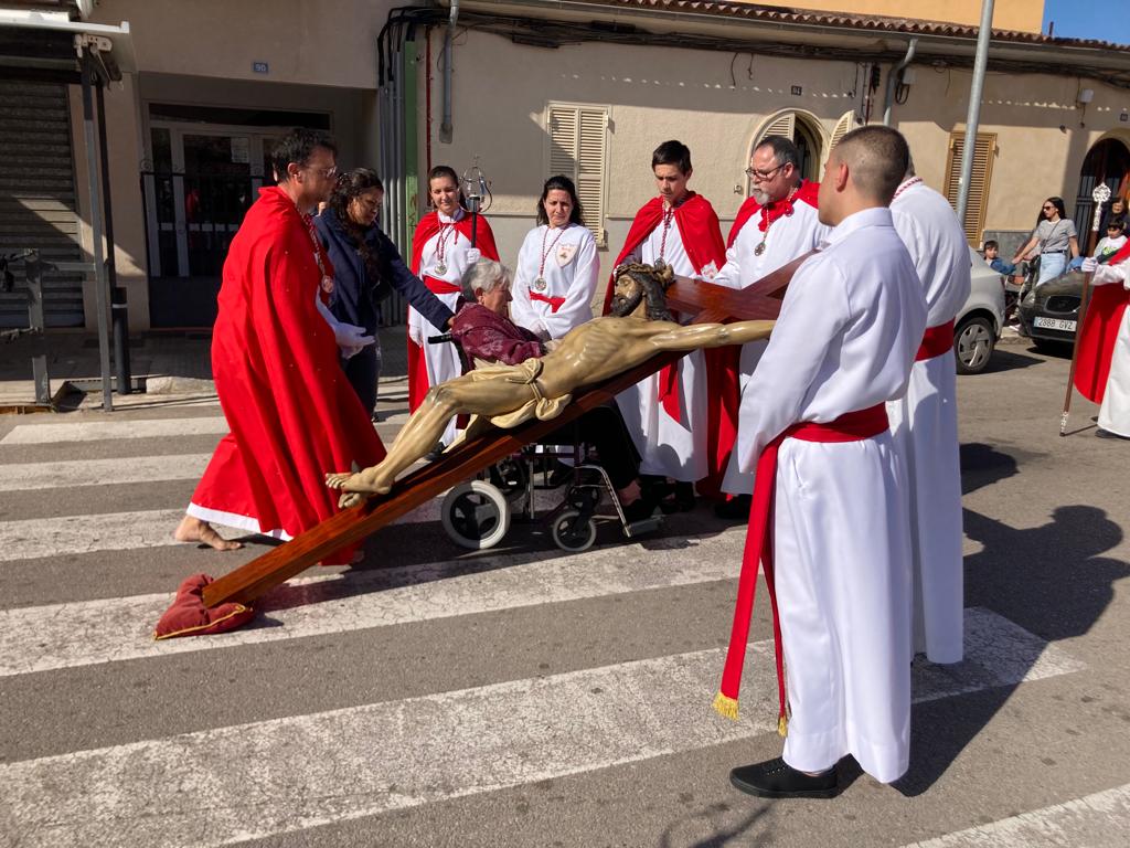 Acompanyats de la banda de tambors, membres de la confraria varen portar a pes la imatge del Sant Crist fins a la residència i una vegada allà, la col·locaren a l’altar que es muntà sota una carpa a l’exterior de l’edifici per poder-hi celebrar l’Eucaristia. També dugueren ramets d’olivera per repartir entre els residents i els seus familiars i així poder representar l’entrada triomfal de Jesuscrist a Jerusalem.