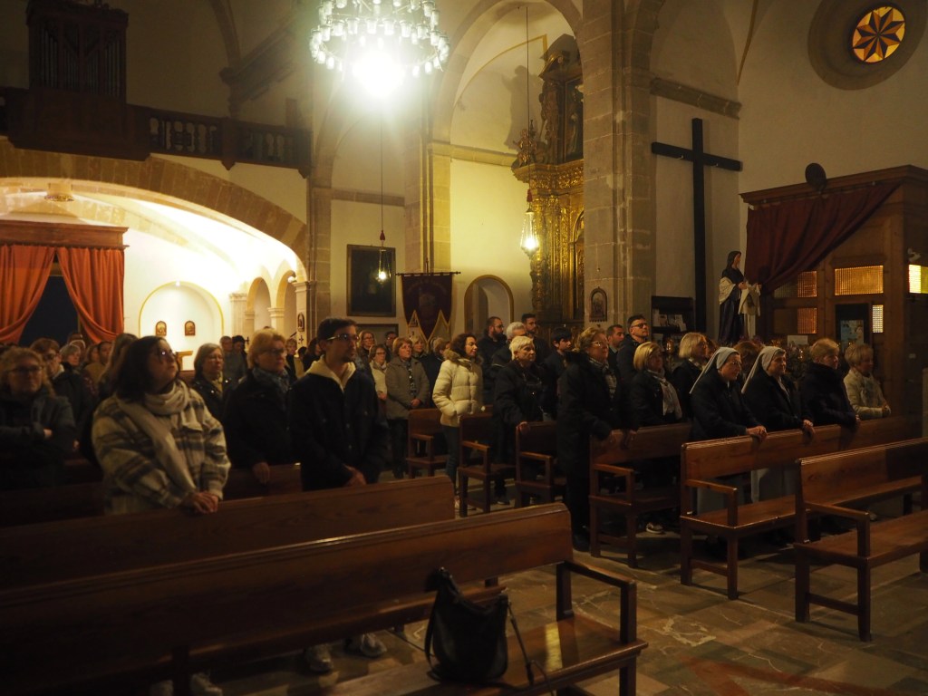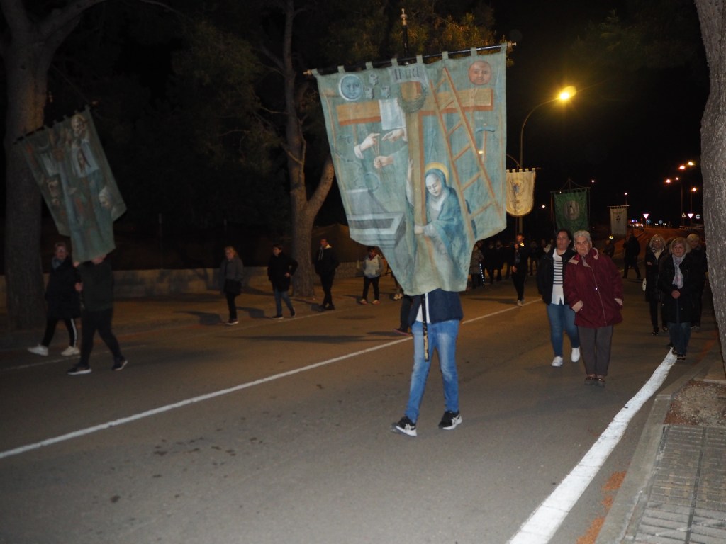Després d’aquesta reflexió introductòria arrenca la processó. Enguany s’ha canviat el recorregut, agafant camins secundaris per evitar entrar en zones de renou. Hi ha un silenci total que convida a pregar. Lentament els assistents es dirigeixen cap a l’església parroquial. I una vegada dins el temple, tots plegats, com a poble de Déu, fan professió de fe cantant el credo. Acaba la processó, però comença la Setmana Santa. Els cristians es tornaran a reunir a l’església per al tridu pasqual, més ben preparats després d’aquesta celebració.