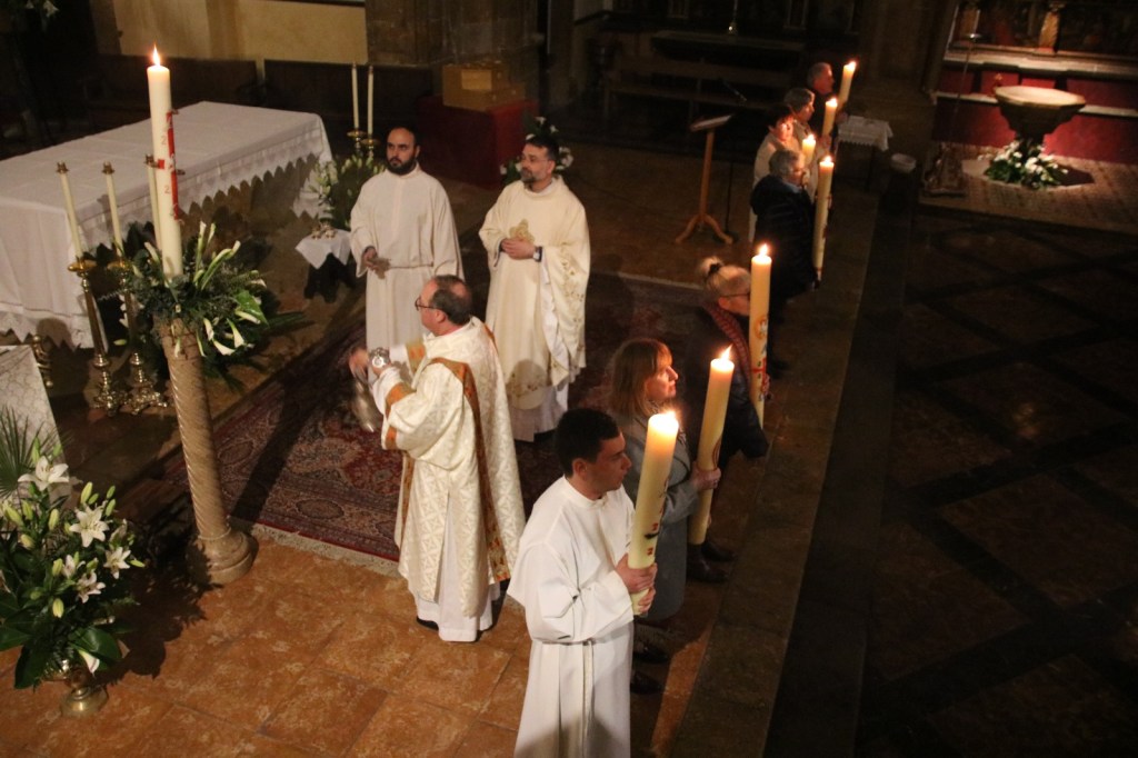 L’Església de Santa Maria la Major d’Inca reunit un any més els cristians de les 8 parròquies que conformen la UP de la Mare de Déu, que han tornat a viure plegats la Vigília Pasqual. Des que va començar l’experiència d’aquesta agrupació de parròquies, és costum celebrar una única Vigília Pasqual com a signe de comunió fraterna en el vespre en què és conmemora el fet essencial de la nostra fe, la resurrecció del Senyor. Tota la celebració està organitzada per expressar aquesta unitat en Crist. Hi són presents tot l’equip de preveres i diaques de la UP. I també hi participen lectors, cantaires i escolans de les diverses parròquies, formant un sol cos que fa possible la celebració. També es beneeixen els ciris Pasquals i les aigües noves de les 8 parròquies, que després de l’Eucaristia tornaran als seus temples origen.