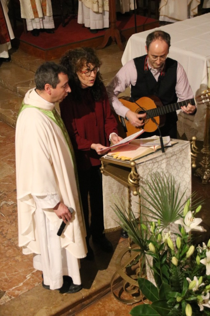 Enguany en aquesta nit tan especial, la UP ha rebut amb goig a tres joves que han passat a formar part de la comunitat cristiana. Cristina, Xisco i Abril ha rebut els tres sagraments d’iniciació cristiana: el baptisme, la confirmació i la comunió, després d’un temps de preparació i acompanyament per part dels seus catequistes. Ha estat un moment molt viscut tant pels nous membres com per tots els assistents, que els han rebut amb un aplaudiment.